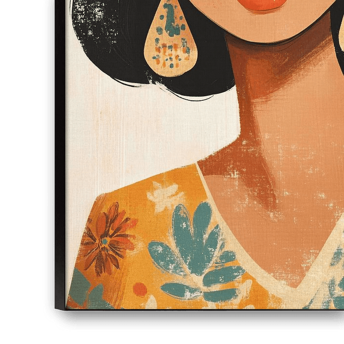 Ce magnifique portrait montre une femme à l'expression sereine, représentée dans un style d'art numérique moderne. Ses cheveux sombres et raides et ses yeux puissants attirent immédiatement l'attention, tandis que ses grandes boucles d'oreilles ajoutent des couleurs et des motifs subtils. Le dessin allie une élégante simplicité à une combinaison ludique de couleurs et de textures. Les tons chauds de sa peau et de ses vêtements contrastent magnifiquement avec le fond doux et abstrait, donnant à l'ensemble un aspect harmonieux. Cette œuvre d'art est parfaite pour être accrochée au mur d'un espace de vie moderne ou d'un bureau pour apporter une touche de style et de sophistication. Il dégage à la fois force et beauté et attire tous les regards dans n'importe quelle pièce.