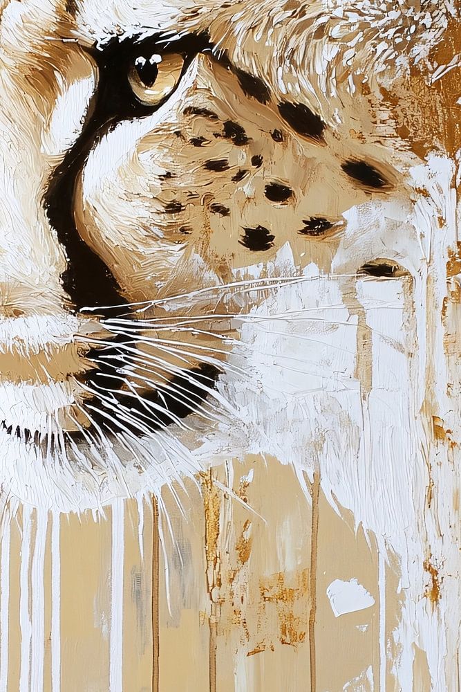 Cette œuvre d'art saisissante représente un magnifique portrait de guépard qui allie réalisme et influences abstraites. Les tons subtils de beige, d'or, de blanc et de noir lui confèrent un aspect sophistiqué et moderne, tandis que les gouttes de peinture créent un effet dynamique et artistique. Parfait pour un salon ou un bureau où l'œuvre d'art sert de point de mire. Le regard puissant du guépard attire l'attention et donne une impression de vitesse et d'élégance, ce qui le rend idéal pour les amateurs d'animaux sauvages et d'art moderne. Ce design apporte un élément apaisant et puissant à n'importe quel espace.