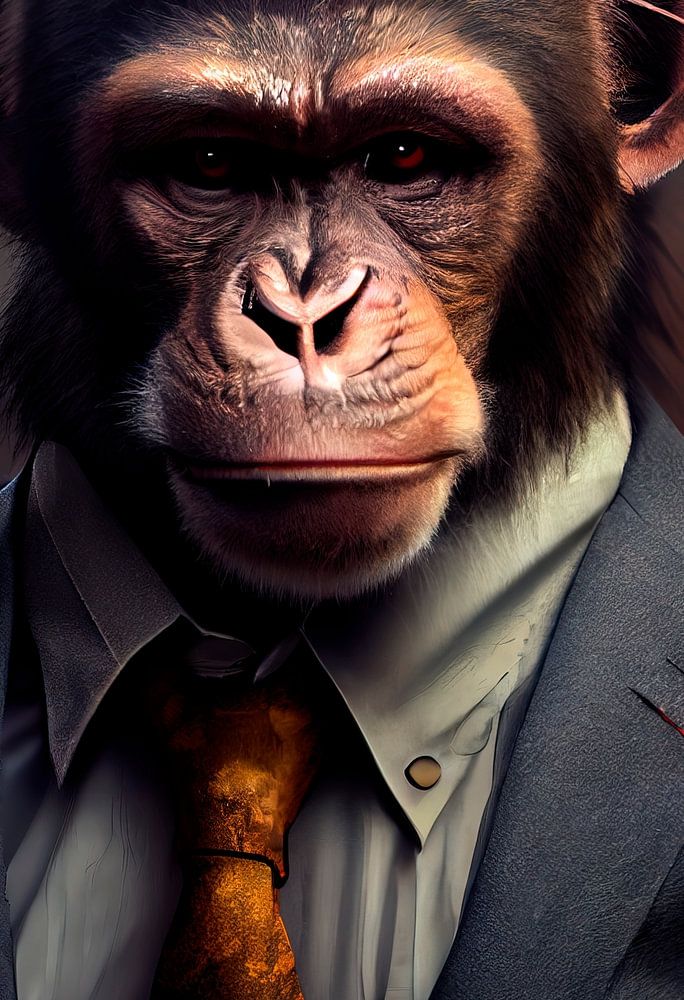 Ce portrait majestueux d'un singe debout, issu de notre collection "Animaux en costume", est l'exemple parfait d'un équilibre délicat entre majesté et espièglerie. De l'art avec une touche d'originalité.