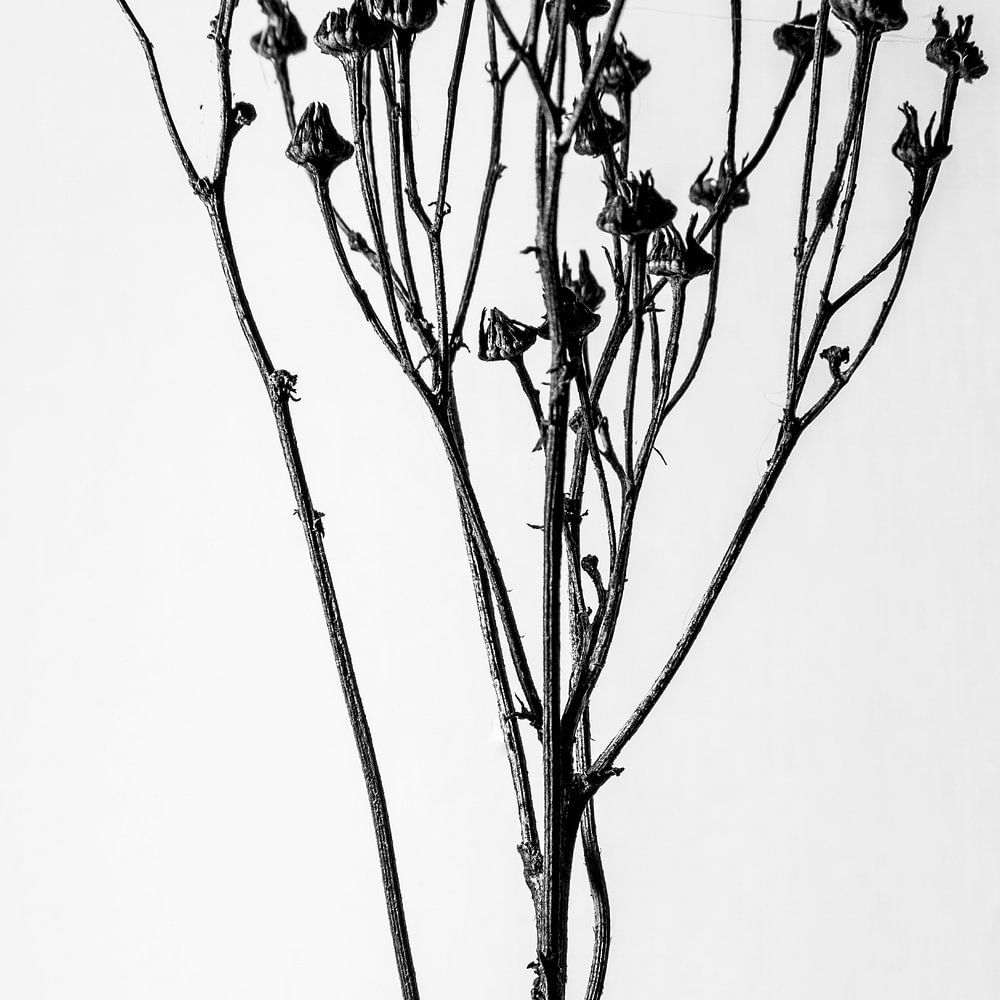 Portrait en noir et blanc de fleurs en déclin sur un fond clair. Ces fleurs ont fini de s'épanouir et les graines sont prêtes à être dispersées.