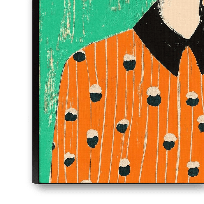 Cette illustration stylisée montre une femme de profil, avec un chignon haut et des mèches libres qui encadrent son visage. Sa peau est claire avec des joues rouges, ses yeux fermés et ses lèvres rouges lui confèrent calme et expression. Elle porte une chemise orange avec des rayures blanches et des points sombres, surmontée d'un col noir. L'arrière-plan est divisé en deux : à gauche, turquoise avec des coups de pinceau visibles, à droite, pêche claire. La représentation graphique minimaliste travaille avec des lignes claires, des couleurs vives et des surfaces planes. L'image mise sur l'équilibre et le contraste, ce qui permet à la femme de se démarquer au centre.