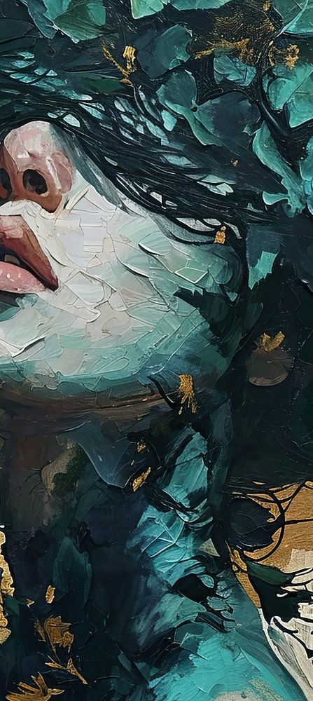 Portrait moderne - Élégance naturelle - Cette toile dynamique témoigne d'une affinité pour la nature et l'élégance. Elle représente une femme dans de somptueuses nuances de vert et de bleu, subtilement rehaussées de touches d'or. Le contraste des formes organiques et de la texture en couches renforce son caractère vibrant et serein, parfait pour un intérieur contemporain qui aspire à une touche de nature luxueuse.