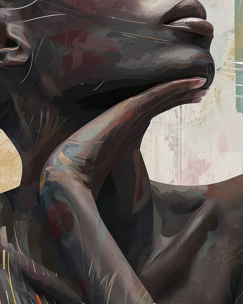 "Une peinture numérique créée par René van den Berg, intitulée 'African Woman in Harmony' ;. Le protagoniste est une femme africaine, représentée dans une pose dynamique et vibrante. Les traits de son visage sont doux et explicites, dégageant un sentiment de calme et de force. La femme est vêtue de vêtements qui jouent avec une palette de tons verts, gris et roses doux, évoquant un sentiment de paix et de beauté naturelle. Ces couleurs se mélangent harmonieusement, tout en contrastant pour mettre en valeur la femme sur le fond abstrait. Le fond lui-même est constitué de formes et de lignes ludiques, qui ajoutent un sentiment de mouvement et d'énergie à l'œuvre. L'utilisation de l'ombre et de la lumière dans le médium numérique donne de la profondeur et de la texture à l'image, créant une expérience presque tangible pour le spectateur. Cette œuvre d'art est une célébration de la beauté et de la force de la femme africaine, capturée dans un style moderne et abstrait ;