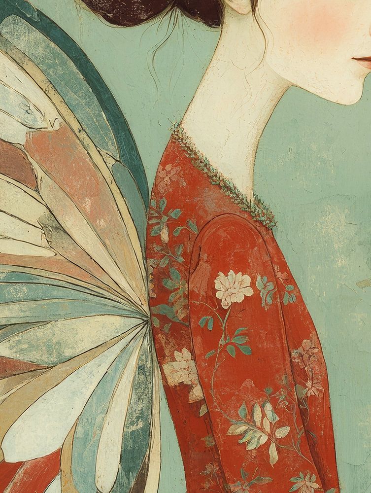 Une femme rêveuse aux ailes de papillon regarde calmement devant elle, comme si elle flottait entre la réalité et la fantaisie. Ses ailes brillent dans des tons doux de crème, de bleu et de rouge, parfaitement assortis à sa robe fleurie. Les fins détails du motif de sa robe rappellent les tapisseries anciennes, pleines d'élégance et de symbolisme. Son regard serein et sa posture gracieuse dégagent une force calme et fragile. De minuscules papillons l'entourent, comme des échos de ses propres ailes. Les textures travaillées de l'arrière-plan confèrent à l'œuvre une beauté intemporelle, presque usée par le temps. La combinaison des couleurs turquoise et rouge crée un contraste harmonieux, à la fois chaleureux et sophistiqué. Ce portrait pictural capture le sentiment d'une imagination tranquille - un moment où tout semble s'arrêter pour un instant. C'est une ode à la douceur, à la féminité et à la magie de la transformation.
