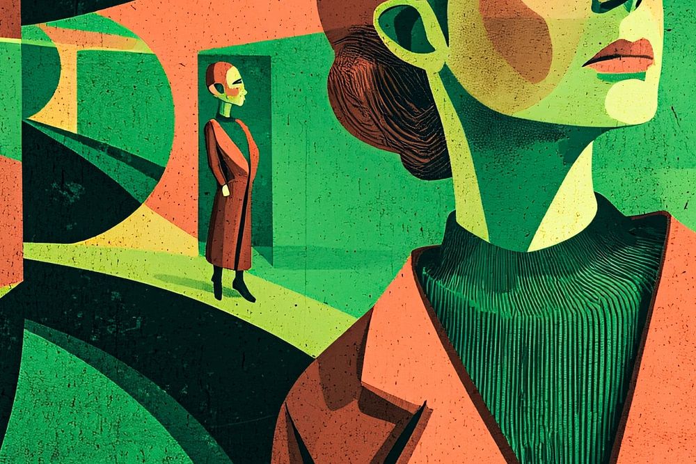 Une magnifique œuvre d'art montrant une femme dans un cadre surréaliste avec des éléments architecturaux frappants. La combinaison dynamique des couleurs vert, orange et jaune crée une atmosphère intrigante. Parfait pour les amateurs d'art moderne ou pour attirer le regard dans un bureau ou une chambre à coucher. Cette œuvre d'art combine un style unique avec un aspect puissant, idéal pour ceux qui veulent faire une déclaration dans leur intérieur.