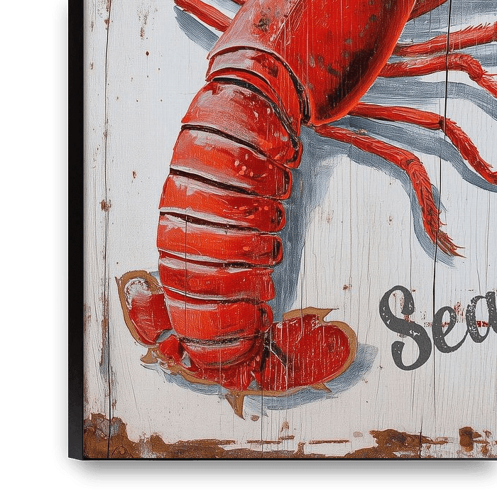 Ce charmant motif vintage représente un magnifique homard rouge sur un fond en bois usé par le temps, qui évoque immédiatement les anciens restaurants de poisson de la côte. Les tons rouge vif et orange du homard forment un magnifique contraste avec le fond en bois usé, blanc et gris, qui présente d'authentiques traces d'utilisation. Les taches de rouille et les parties écaillées de la peinture sont particulièrement attrayantes et confèrent au tableau son caractère shabby chic inimitable. La typographie peinte à la main avec "Lobster" et "Seafood" renforce le charme nostalgique de cette représentation. Le style artistique rappelle les enseignes classiques des diners américains et la décoration maritime. La représentation réaliste du homard, avec ses pinces et ses antennes richement détaillées, témoigne d'un savoir-faire artisanal et fait de cette œuvre un véritable accroche-regard pour tout amateur d'art maritime.