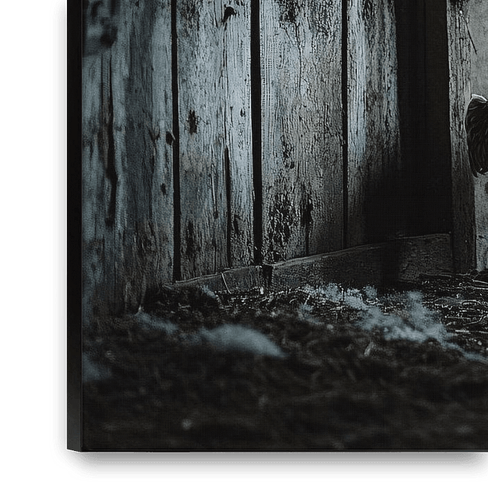 Cette photographie atmosphérique montre un poulet solitaire marchant curieusement dans une vieille grange abandonnée. La lumière naturelle qui tombe de l'extérieur donne à la grange un aspect mystique, tandis que les murs usés par les intempéries et le sol poussiéreux évoquent un sentiment de nostalgie et de simplicité. Ce motif est…