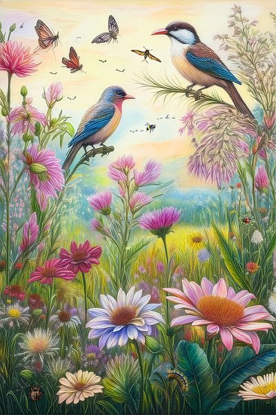 Paysage, fleurs, oiseaux, insectes, comme un vieux chef-d'œuvre mais dans une version moderne. Romantique et rêveur. Créé à partir de ses propres photos et dessins, édité avec Photoshop et AI.