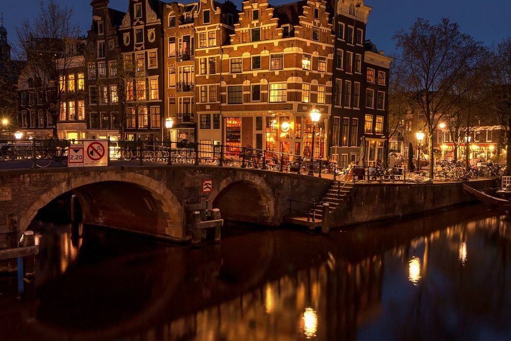 Photo du soir pendant l'heure bleue des canaux d'Amsterdam près de l'écluse du Moulin à papier.