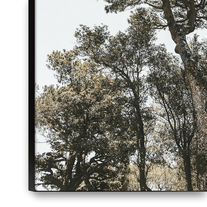 L'arrière-plan de l'image montre un paysage luxuriant de verdure, où les arbres sont proches les uns des autres. Les couleurs vont du vert clair au vert foncé, formant un riche tapis végétal. La lumière du soleil tombe doucement sur les feuilles, créant un beau mélange d'ombre et de lumière.