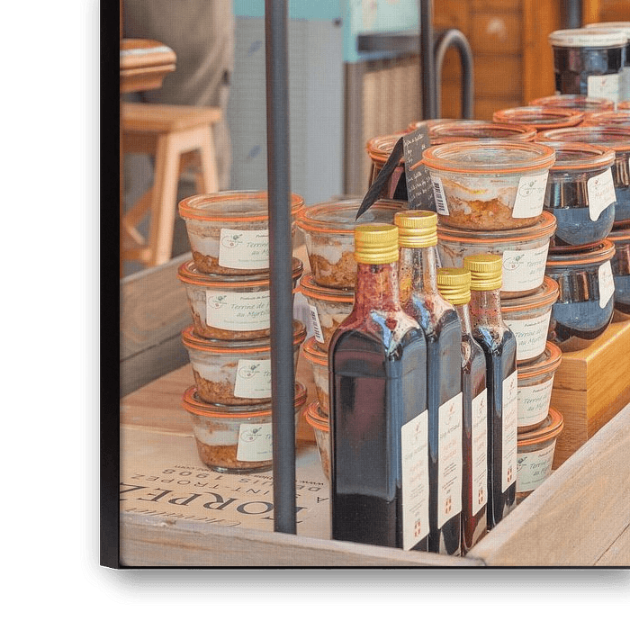 Des produits aux couleurs pastel bordaient la rue. Dans un café, il y avait une délicieuse gamme de produits. Miel, sirop, confiture et biscuits.