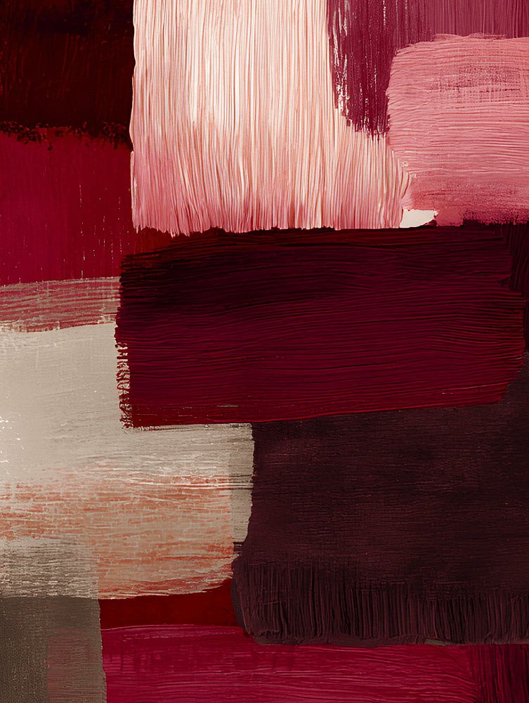Une œuvre abstraite puissante composée de zones de couleurs superposées dans les tons bordeaux, blush et terre. La composition est solide et équilibrée, ajoutant instantanément du caractère à un espace sans le dominer.