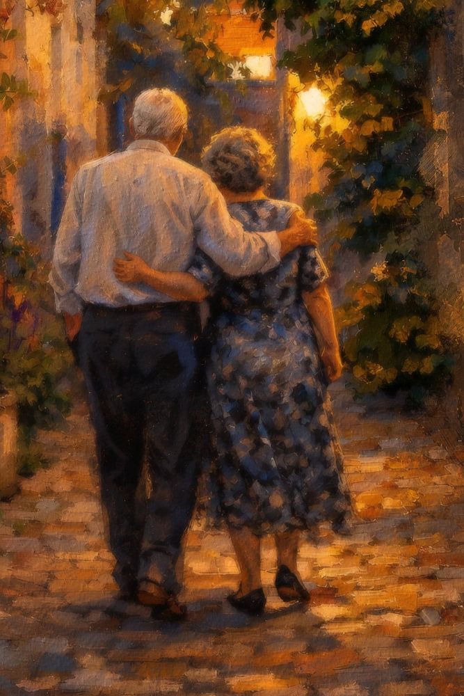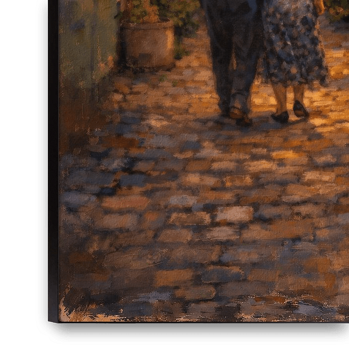 Cette peinture numérique pleine de charme représente un couple âgé marchant bras dessus bras dessous dans une charmante ruelle pavée au crépuscule. La lumière chaude du réverbère se reflète sur les pavés et contraste magnifiquement avec la fraîcheur de l'air du soir, créant une atmosphère intime et nostalgique. La touche picturale et…