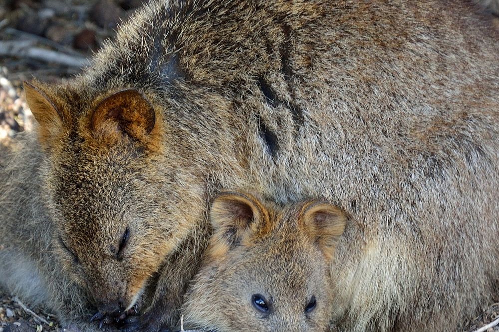 En nous promenant à vélo sur l'île de Rottnest, en Australie occidentale, nous avons eu la chance de croiser quelques quokkas. Les quokkas sont de petits marsupiaux et de loin les animaux les plus mignons et les plus heureux du monde. Ils ne vivent que sur l'île de Rottnest et sont très habitués à l'homme, si bien qu'il est très facile de les approcher. Il est même possible de les caresser. Nous avons adoré voir cette maman quokka protéger ses petits.