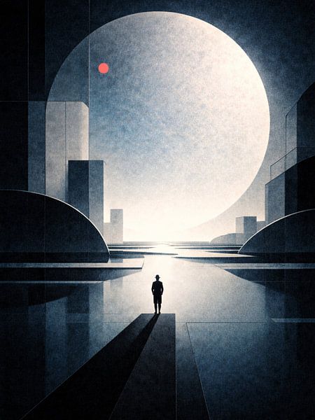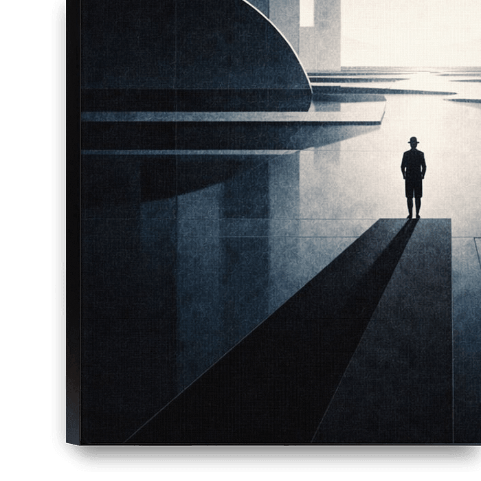 Une figure solitaire se tient dans des structures verticales rigides, entourée de formes géométriques froides et d'un vaste espace négatif.