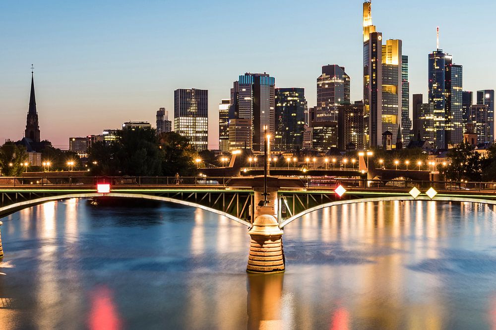 Skyline de Francfort-sur-le-Main avec le quartier des banques et le pont Ignaz Bubis la nuit.
