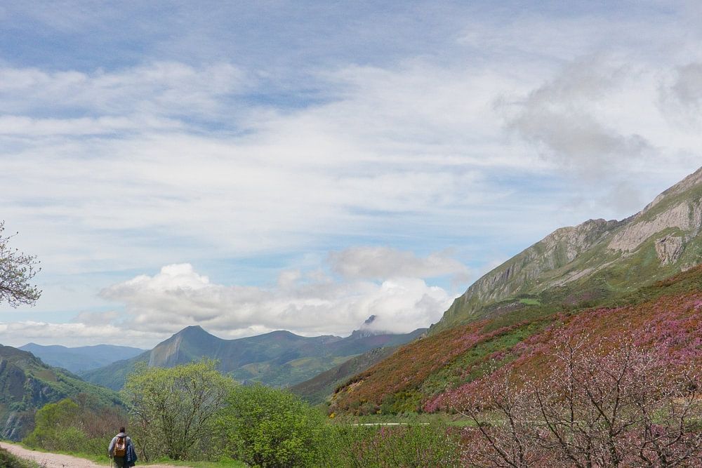 Un randonneur solitaire marche sur un sentier sinueux à travers les montagnes verdoyantes. Les pentes sont couvertes de fleurs d'un rose éclatant, offrant un contraste saisissant avec le ciel bleu et les sommets gris en arrière-plan. La scène respire la paix et l'aventure et invite à l'exploration de la nature.