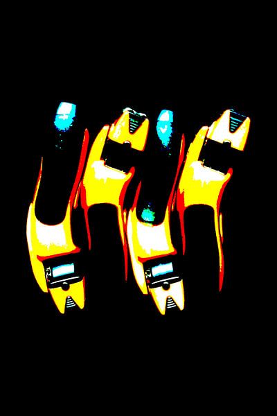 Œuvre abstraite ; quatre rasoirs en jaune, rouge, blanc et bleu clair sur un fond noir.