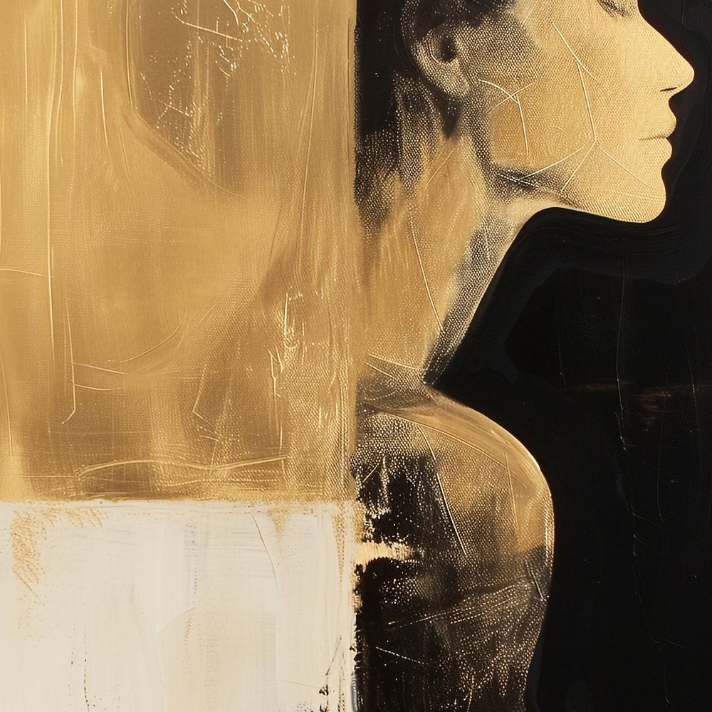 Profil latéral d'une femme, peint sur un fond contrasté divisé en deux parties. La partie gauche de la toile est remplie d'une riche teinte dorée qui rayonne de vitalité et de chaleur, tandis que la partie droite est d'un noir profond qui évoque le mystère et la profondeur. La femme semble prise entre ces deux mondes, les traits de son visage se fondant doucement dans le jeu d'ombre et de lumière. Les lignes épurées et l'utilisation minimaliste des couleurs créent un impact visuel puissant et un sentiment d'introspection et de contemplation.