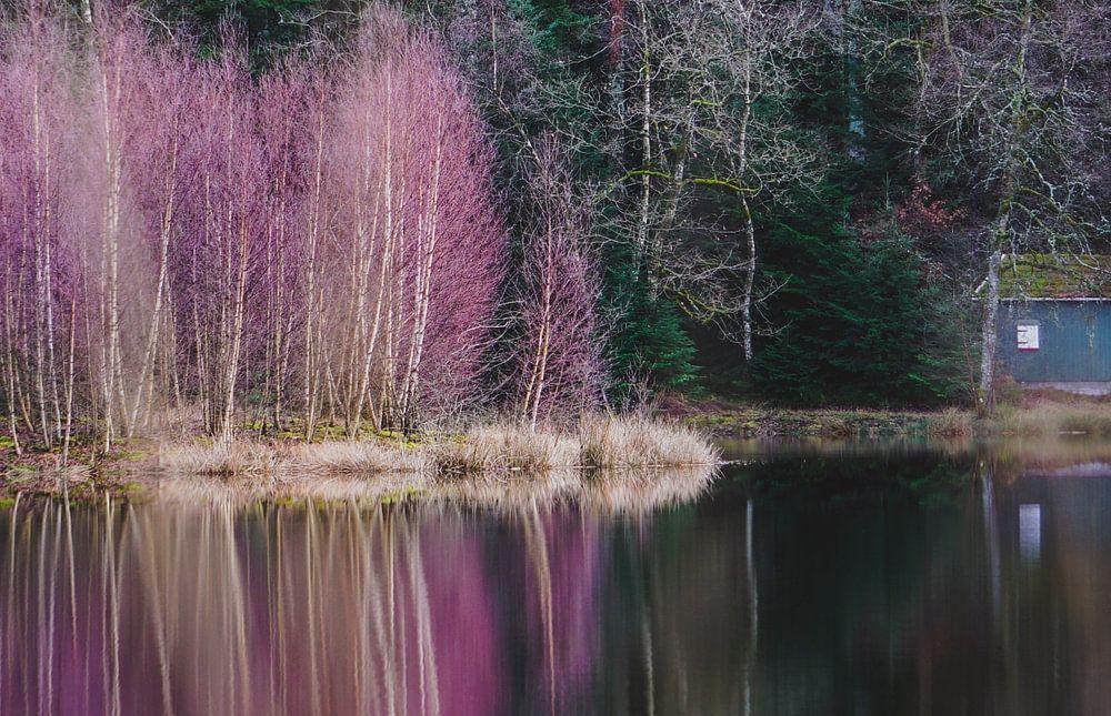 La petite maison en bois turquoise caractéristique se trouvait à l'endroit idéal : à côté de branches sans feuilles à la lueur violette. Pour cette photo, j'ai créé un point de vue, à travers les longues herbes qui se trouvaient sur le côté du petit lac.