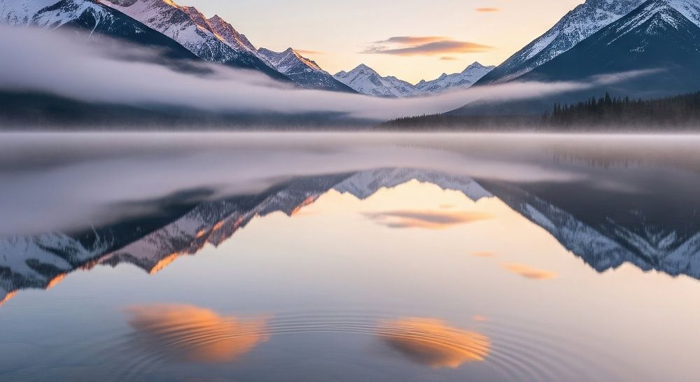 Paysage panoramique d'un lac calme reflétant des montagnes enneigées et des nuages à l'aube. Des rochers se trouvent au premier plan.
