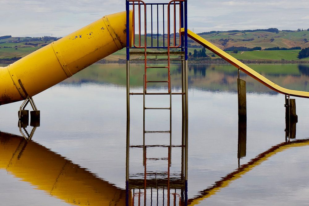 Découvrez la tranquillité enchanteresse du lac Waihola en Nouvelle-Zélande, où un simple toboggan constitue une image emblématique de ce paysage serein. Les eaux calmes du lac reflètent le toboggan et la nature environnante dans une symétrie parfaite, créant un effet presque surréaliste et apaisant. La combinaison des couleurs subtiles du ciel, du miroitement de l'eau et du reflet du toboggan en fait une scène unique qui célèbre la simplicité et la beauté.