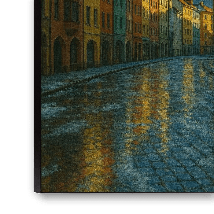 Exécutée dans un style réaliste et atmosphérique influencé par Edward Hopper, cette peinture célèbre le contraste entre le calme de la montagne et la grâce de la ville. La rue est à la fois vide et vivante, chaque fenêtre et chaque reflet portant les traces d'une vie invisible. La composition équilibre la géométrie et la lumière, évoquant une introspection calme et une beauté intemporelle.