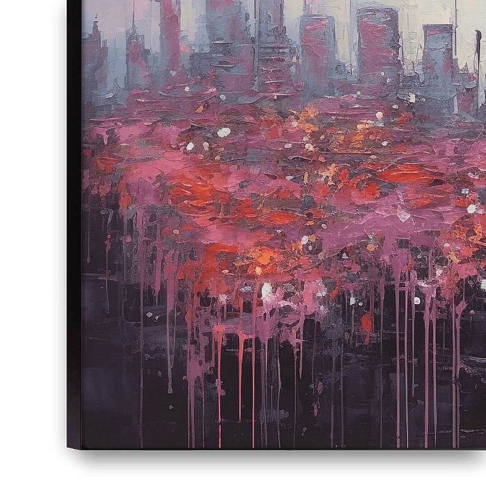 Ce tableau est un mélange fascinant de couleurs et de formes qui redéfinit le paysage urbain. Il invite les spectateurs à voir la ville à travers une lentille kaléidoscopique, où des formes abstraites et des teintes vibrantes créent un paysage urbain dynamique et en perpétuel changement.