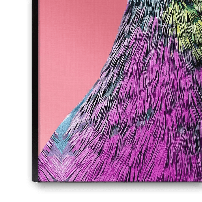 Illustration numérique étonnante et hyper-détaillée d'un pigeon, présentant des plumes irisées dans des tons violets, verts et dorés sur un fond rose tendre. Cette œuvre combine le réalisme avec une touche de pop art, parfaite pour les amateurs d'oiseaux, les collectionneurs d'art moderne et tous ceux qui cherchent à ajouter une touche de couleur et de sophistication à leur décoration murale. Le regard saisissant du pigeon et le plumage éclatant donnent à cette œuvre d'art une présence majestueuse et fière.