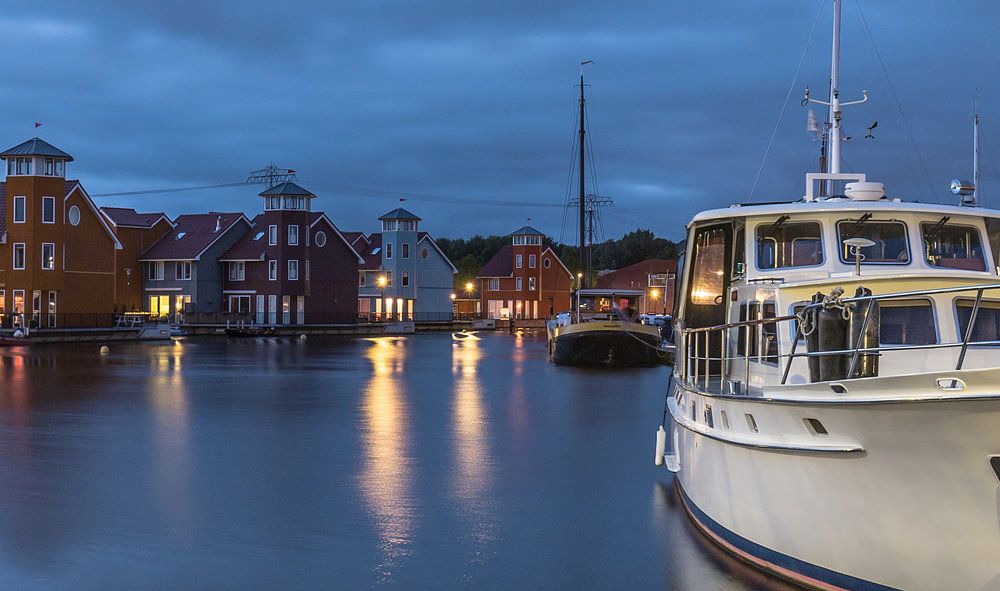 Uniek gelegen aan de “staande mastroute” met uitstekende vaarverbindingen vind u de ruime jachthaven met kleurrijke “Scandinavische” bebouwing. Dee foto is gemaakt tijdens het blauwe uurtje.