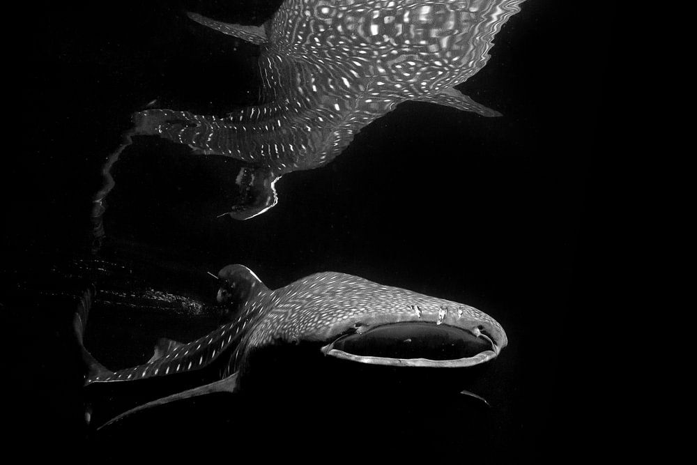 Un requin-baleine juste sous la surface de l'eau. Vous obtenez ainsi un reflet.
