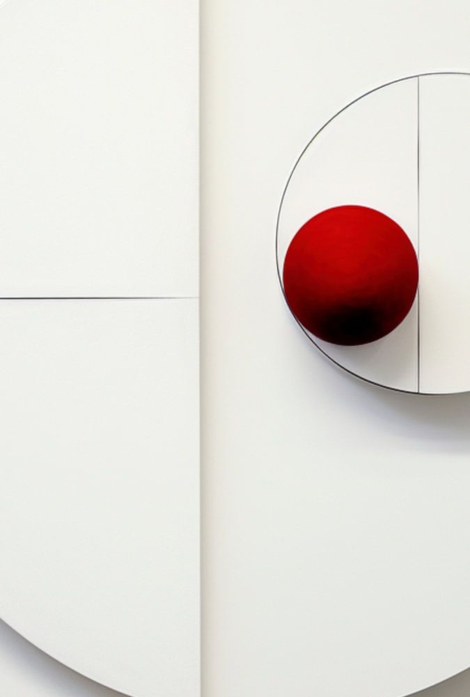 La sphère rouge n'est pas seulement un élément visuel, mais un symbole de dynamisme et de calme ; elle représente une rupture mais s'intègre parfaitement dans son environnement. Chaque ligne, courbe et couleur de "Resolute" est délibérée, invitant les spectateurs à plonger dans leur interprétation.