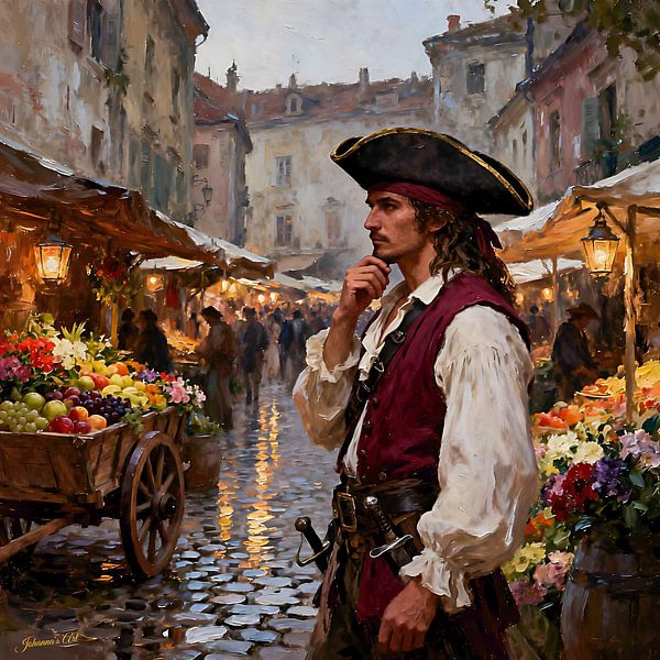Un homme en costume historique se tient debout, pensif, dans une rue pavée où la douce lueur des lampes éclaire le marché animé qui l'entoure. Les étals débordent de fleurs, de fruits et d'objets artisanaux aux couleurs éclatantes qui se détachent sur les pierres texturées qui se trouvent sous ses pieds. L'air semble animé d'une énergie tranquille - le doux murmure des conversations, le bruissement subtil des pétales et le parfum des fleurs fraîches qui se mêle à l'arôme de terre de la rue. Il regarde la rue, entre le rythme de la vie quotidienne et l'immobilité de la réflexion, comme s'il contemplait à la fois la beauté qui s'offre à lui et le passage du temps lui-même. La lumière et l'ombre jouent sur la scène, soulignant les plis complexes de ses vêtements et les détails vibrants du marché, créant un sentiment d'intimité et d'intemporalité. À cet instant, la rue se transforme d'une simple voie de circulation en un tableau vivant, où convergent l'histoire, la présence humaine et le monde naturel. La scène capture la poésie de la vie quotidienne, un mélange harmonieux de couleurs, de lumière et de contemplation, invitant le spectateur à s'arrêter et à savourer la richesse tranquille d'un moment unique et fugace.