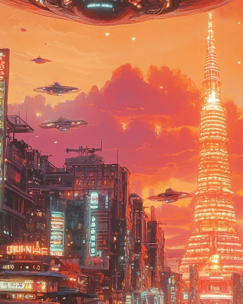L'image représente un paysage urbain animé, baigné par la lueur chaude d'un soleil couchant. De grands bâtiments futuristes bordent les rues, ornés d'enseignes au néon et de fenêtres lumineuses. Dans le ciel, plusieurs soucoupes volantes planent au-dessus de la ville, créant un sentiment d'émerveillement et d'anticipation. La scène est remplie de gens qui vaquent à leurs occupations quotidiennes, marchant sur les trottoirs et conduisant des voitures anciennes.