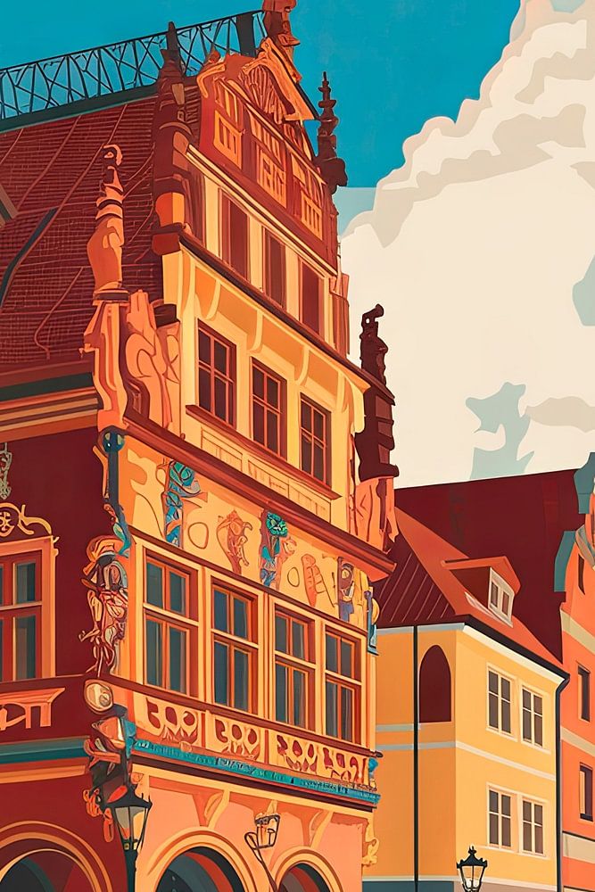Une splendeur architecturale unique se déploie le long du pittoresque canal, où les couleurs vives et les détails artistiques donnent vie au décor historique de Riga. L'élégante façade incurvée au premier plan dégage une atmosphère accueillante, tandis que les nuages passent doucement au-dessus de l'horizon, créant l'image magique d'une charmante ville européenne.