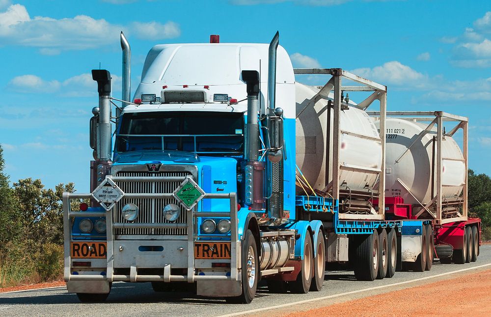 Een Roadtrain, vrachtwagen, op een asfaltweg in West Australië tegen een blauwe lucht met lichte bewolking