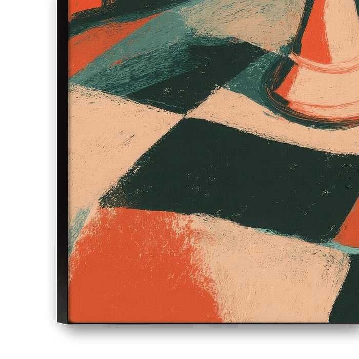 L'illustration montre un roi blanc stylisé au centre d'un échiquier de carrés noirs et blancs. Le roi est légèrement tourné vers la gauche, avec une couronne visible et une surface lisse et mate. L'échiquier est plat et graphique, les carrés blancs avec de fines lignes noires, les carrés noirs solides. Le fond est divisé en deux blocs de couleur : rouge orangé à gauche, noir à droite, ce qui crée un fort contraste. La composition est minimaliste et abstraite, avec des formes claires et des coups de pinceau visibles qui donnent de la texture, et met l'accent sur le roi et l'interaction entre la couleur et la forme.