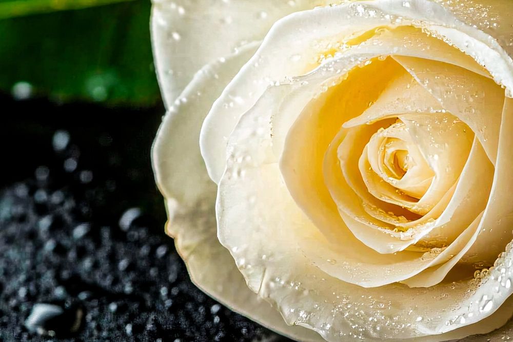 Cette belle image montre une élégante rose blanche recouverte de délicates gouttelettes d'eau. La structure délicate des pétales dégage une beauté intemporelle, tandis que les gouttes ajoutent un détail rafraîchissant et vibrant. Parfaite pour les amoureux de la nature et de l'élégance, cette image peut servir de décoration dans différentes pièces, de la chambre à la salle à manger. Un mélange harmonieux de simplicité et de sophistication, idéal pour tout intérieur.