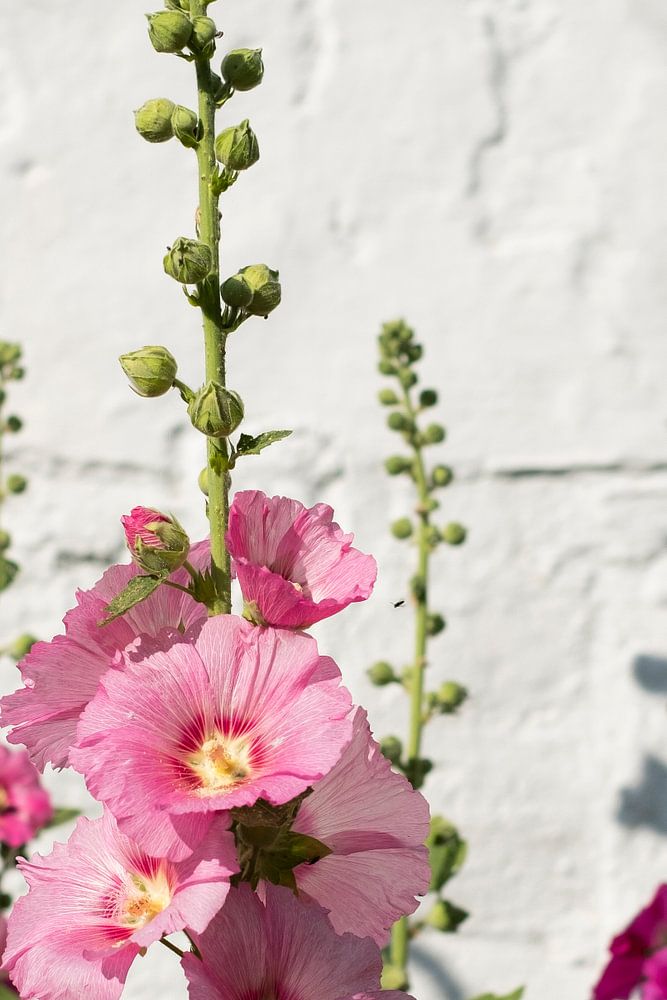 Cette belle rose trémière se tient devant un vieux mur blanchi à la chaux. La rose trémière (Alcea rosea, synonyme : Althaea rosea) est une plante bisannuelle de la famille des herbes à fromage (Malvaceae). Les noms populaires sont la rose chauve, la rose de l'agriculteur et la rose trémière, bien que ce dernier nom soit trompeur car la rose trémière est le nom officiel d'une autre plante de la famille des herbacées.