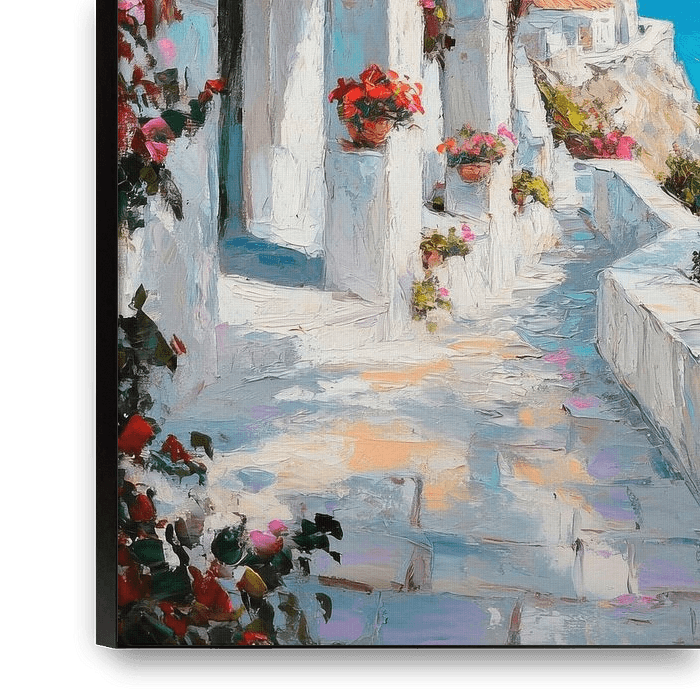 Un sentier pittoresque serpente le long des falaises, bordé de bougainvilliers en fleurs d'un rose intense. En dessous, l'eau d'un bleu azur scintille tandis que les nuages traversent doucement le ciel. Cette idylle donne l'impression d'un rêve où le temps semble s'être arrêté, parfait pour les pensées romantiques et les moments…