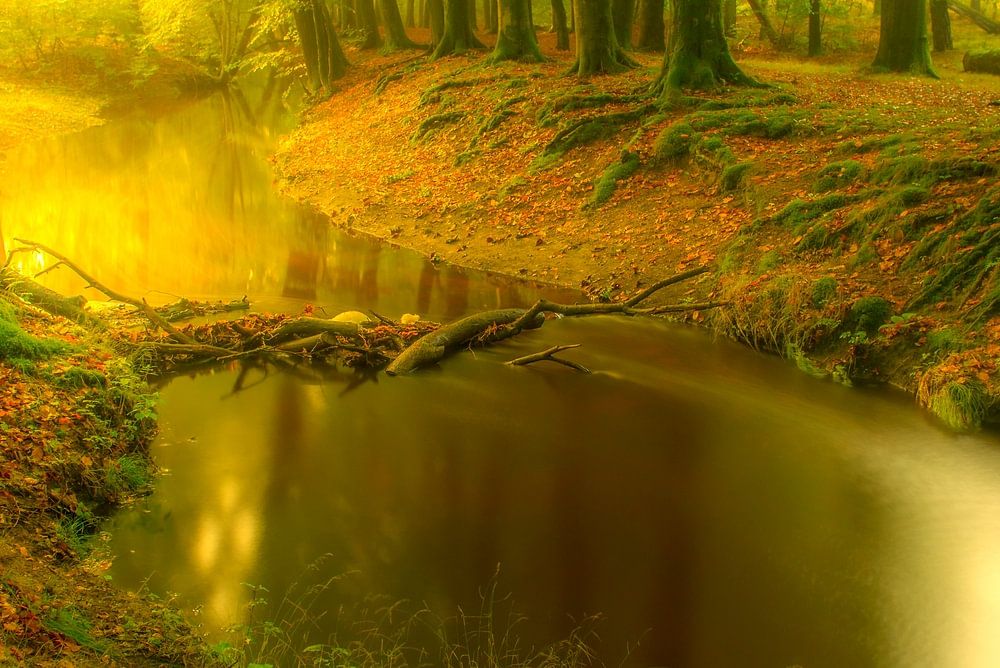 Scène automnale paisible dans le Leuvenumse Bos, qui fait partie de la réserve naturelle de Veluwe en Gelderland. Un ruisseau forestier aux courbes douces reflète la lumière dorée filtrant à travers une dense canopée d'arbres. L'eau semble soyeuse et lisse, suggérant une photographie à longue exposition qui renforce l'atmosphère…