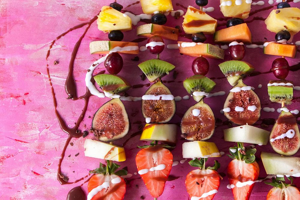 Brochettes de fruits avec sauce au chocolat et crème de coco, myrtille, melon, fraise, fruit, sucré, savoureux, festif, art alimentaire, kiwi, ananas, coloré, coloré, fond rose, rose, rouge, couleurs chaudes