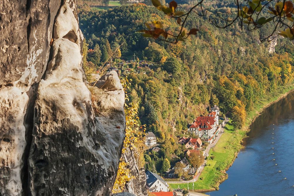 Aussicht von der Bastei zum Kurort Rathen und zum Fluss Elbe. Die Bastei ist eine der meistbesuchten Touristenattraktionen im Nationalpark Sächsische Schweiz, Gemeinde Lohmen, Sachsen, Deutschland, Europa