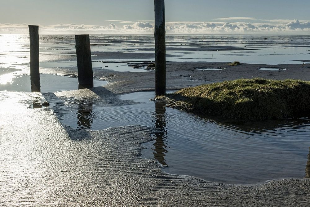 La photographie de paysage "Sankt Peter-Ording I" montre des poteaux en bois et des criques dans la mer des Wadden, à contre-jour du soleil. À l'horizon, une bande de nuages s'étend au-dessus de la mer du Nord. Prise lors d'une journée ensoleillée de l'hiver 2025.
