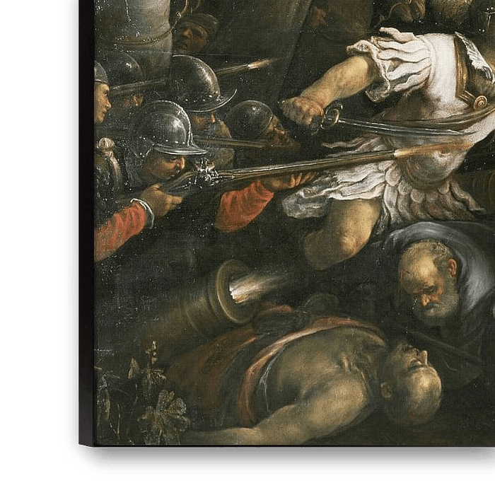 Scène de bataille : Charles VIII recevant la couronne de Naples, Francesco Bassano (1590) Des épées qui s'entrechoquent, un enchevêtrement de corps, la confusion règne sur ce champ de bataille. Au milieu de la mêlée, un chevalier en armure, tenant une épée et un sceptre portant la fleur de lys, reçoit la couronne que lui tend un enfant. Le peintre vénitien Francesco Bassano représente ici la conquête de Naples par le roi français Charles VIII, désireux de récupérer l'ancienne province française. Cependant, cette bataille n'a jamais eu lieu. Le 22 février 1495, Charles VIII se voit remettre les clés de la ville sans avoir à combattre.