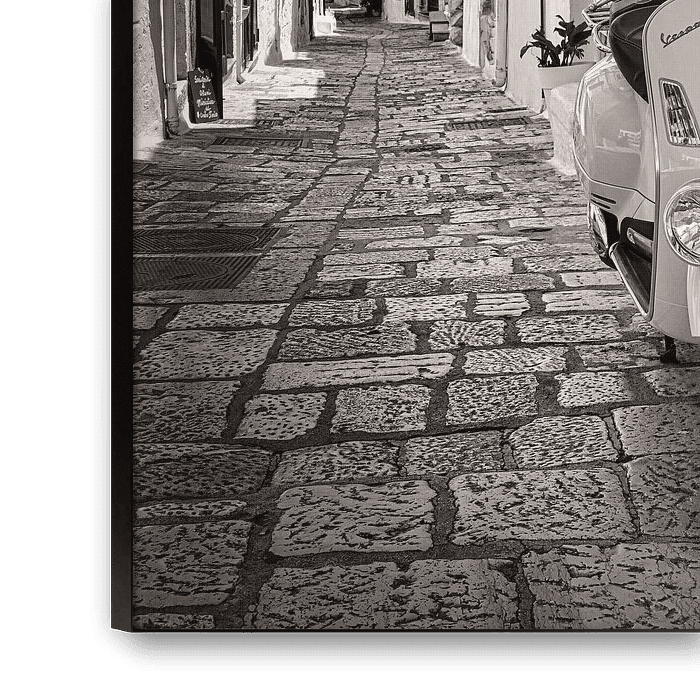 Achetez cette photo Scooter Vespa dans une rue en Italie en sépia par iPics Photography sur toile, aluminium, ArtFrame ou photographie (encadrée), impression d'art en haute qualité et tout format.
