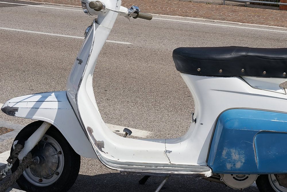 vieux scooter nostalgique Lambretta J 50 au bord de la route dans la commune de Nago-Torbole sur le lac de Garde en Italie. Les vieilles motos sont toujours un moyen de transport très apprécié dans les villes côtières autour du lac de Garde.