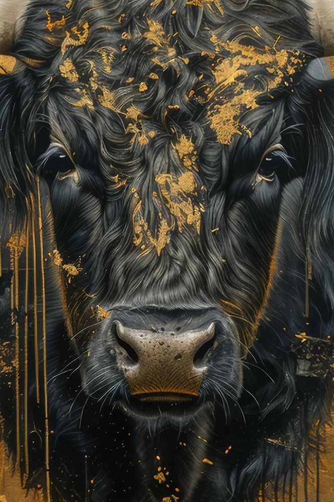 Ce portrait impressionnant d'un Highlander noir est rehaussé par les riches accents dorés qui parsèment la toile. Les tons noirs profonds du pelage contrastent magnifiquement avec le fond doré brillant et abstrait, donnant à l'animal une allure à la fois puissante et sophistiquée. La texture détaillée de la fourrure et les éclaboussures subtiles de peinture dorée ajoutent un sens du mouvement et de l'élégance à cette œuvre d'art. Idéal pour les amateurs d'art animalier moderne et luxueux qui souhaitent marquer leur intérieur.