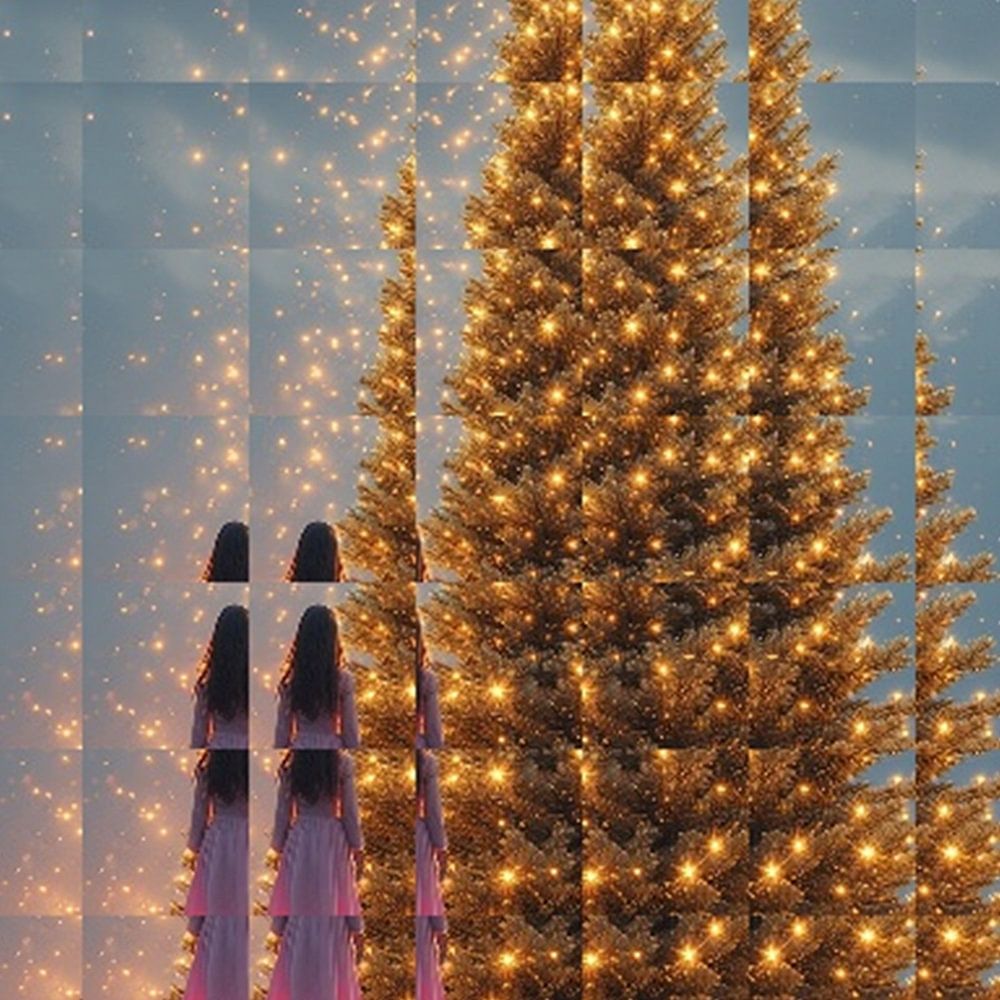 A propos de "Sculpture abstraite moderne d'une jeune femme avec un arbre de Noël."