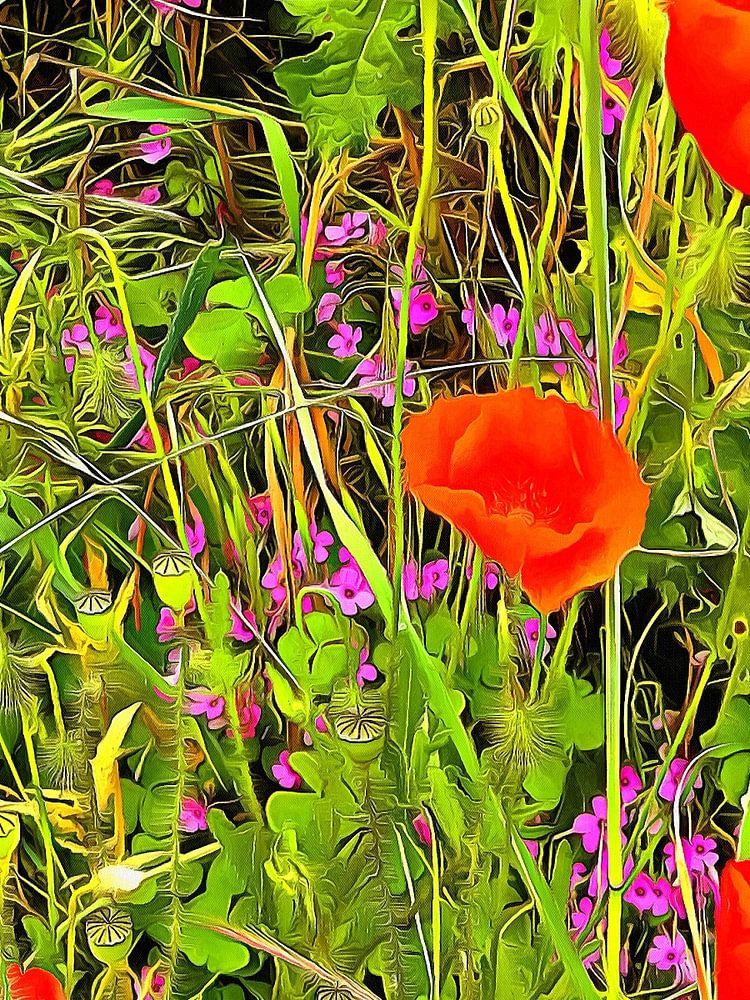 Les coquelicots rouges sont des fleurs sauvages tellement dominantes, vous ne trouvez pas ? En mai, dans le centre de l'Italie, où je vis, ils sont partout et tellement beaux ! Il y a d'immenses champs de coquelicots rouges qui sont à couper le souffle, mais ils apparaissent aussi dans les haies et dans les zones herbeuses. Elles adorent les sols perturbés et prospèrent ! Cette domination signifie que nous nous arrêtons souvent aux pétales rouge vif qui flottent dans la brise et que nous ne regardons pas plus loin. Parfois, comme ici, si vous êtes attentif, vous pouvez trouver une petite fleur sauvage discrète qui se cache derrière les coquelicots rouges, et elles sont tout aussi jolies, mais pas aussi visibles !